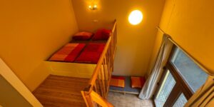 Im Studio, kleine Einraumwohnung mit kleine Teeküche mit Toaster , Kaffeebereiter, Wasserkocher, Mikrowelle, Geschirr ( kochen nicht möglich), Bad mit Glaswand und Glasschiebetür,Schlafgalerie- erreichbar über eine Treppe, können bis zu …